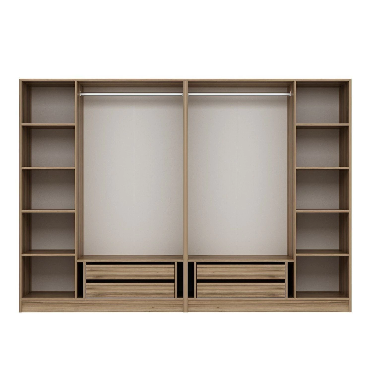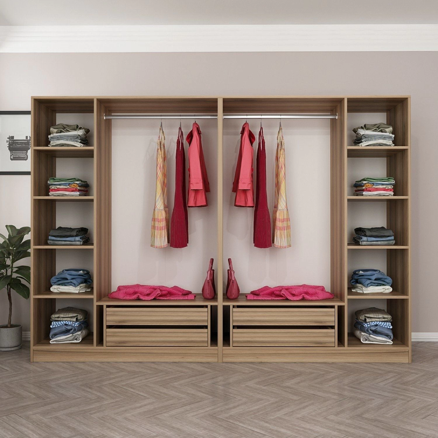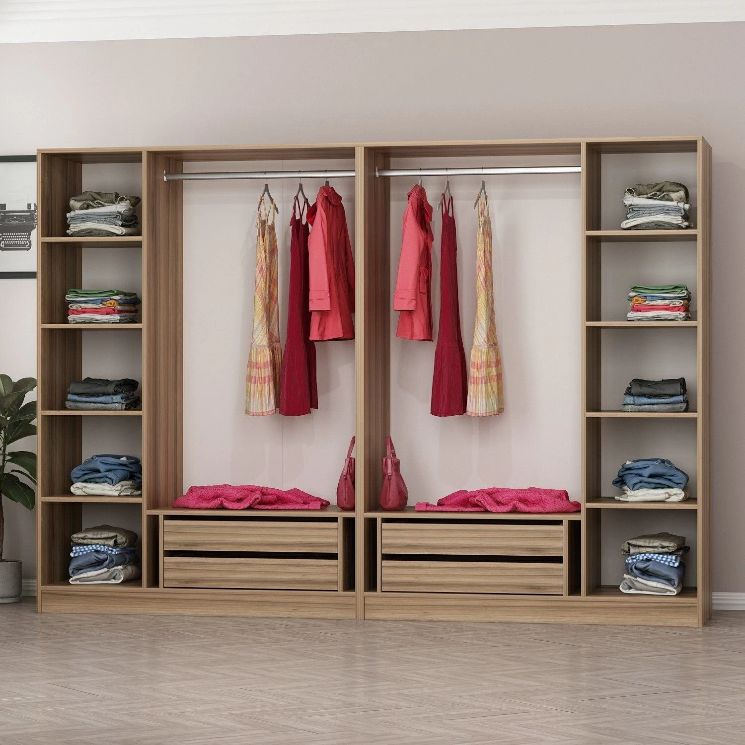 Met zijn vele legplanken biedt deze kast aanpasbare opbergmogelijkheden, zodat al je spullen een eigen plek hebben. Of het nu gaat om kleding, schoenen of accessoires, je kunt alles netjes organiseren binnen handbereik. De planken zijn ontworpen om de ruimte optimaal te benutten, zodat je items gemakkelijk kunt vinden en pakken als dat nodig is.